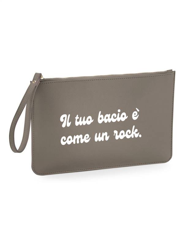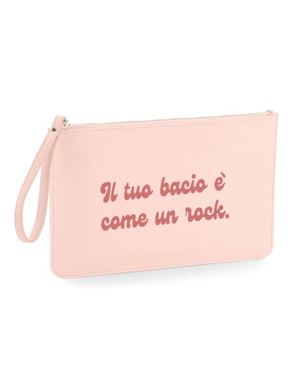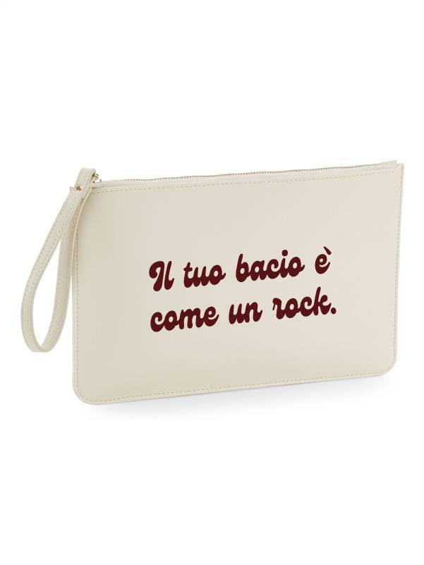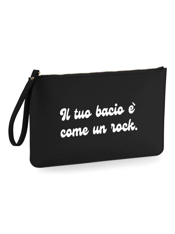 Pochette in ecopelle da donna con la scritta “il tuo bacio è come un rock”.