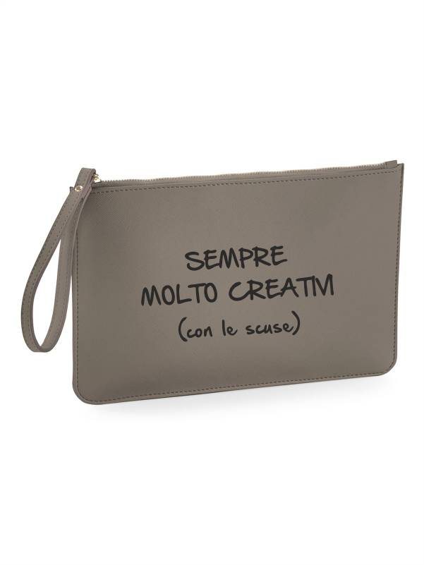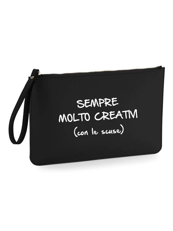 Pochette in ecopelle da uomo con la scritta “sempre molto creativi (con le scuse)”.
